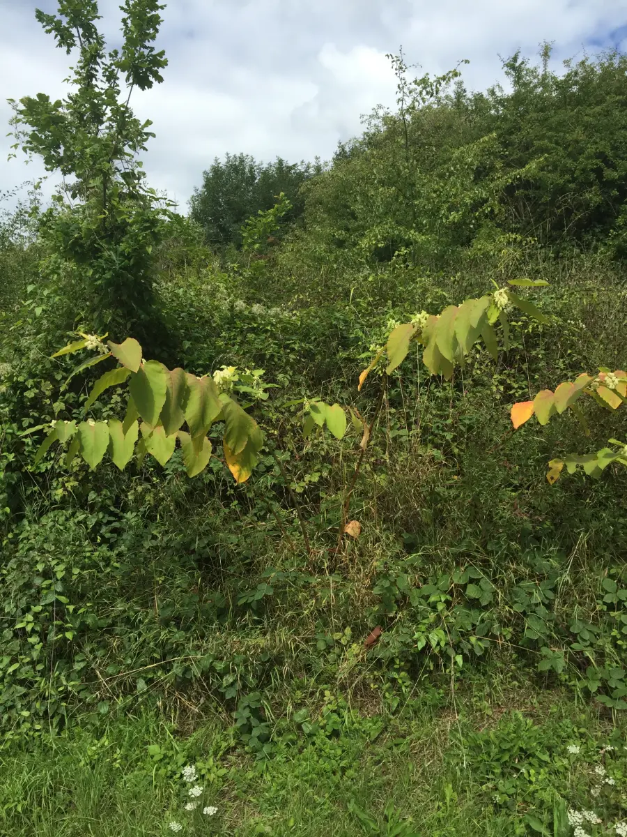 Himalayan Balsam (Impatiens glandulifera), another invasive species, can form dense stands but has toothed leaf edges, pink-purple flowers and reddish stems but not hollow or bamboo-like. The seed pods of Himalayan Balsam also explode when touched – a characteristic not found in knotweed.