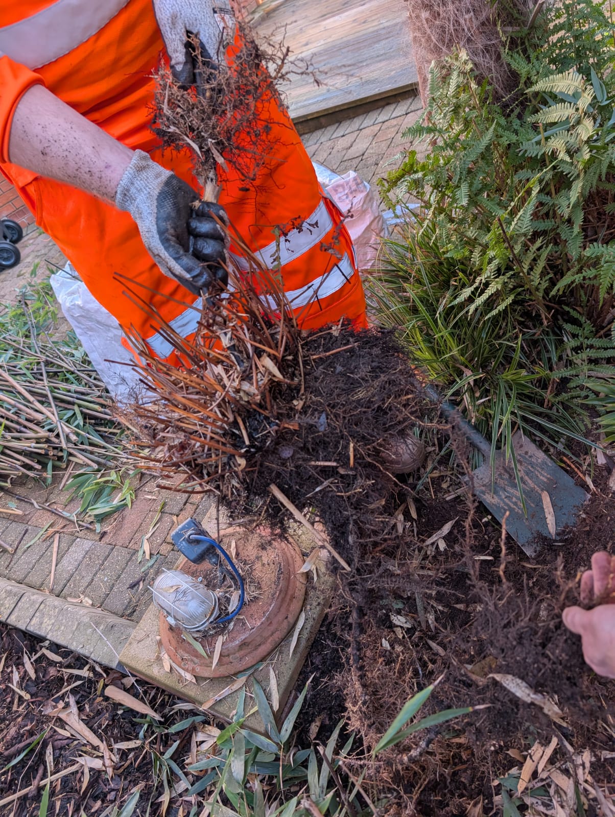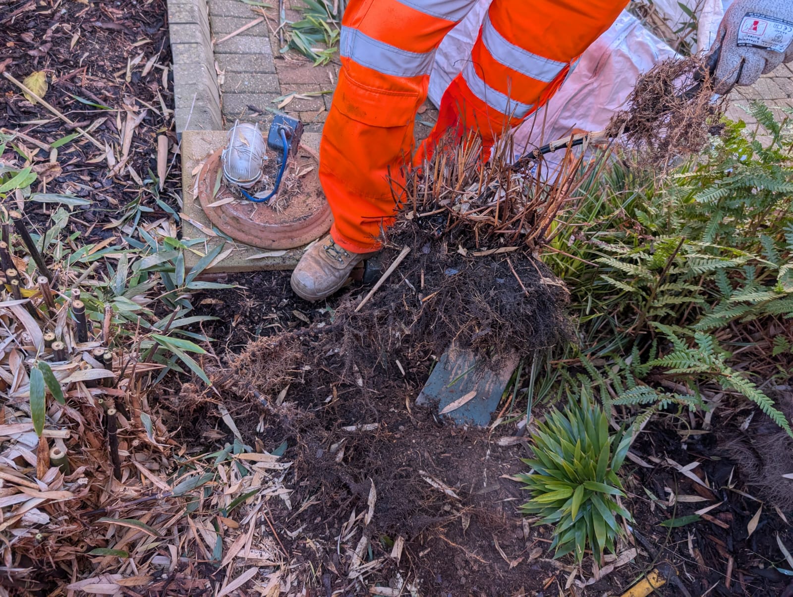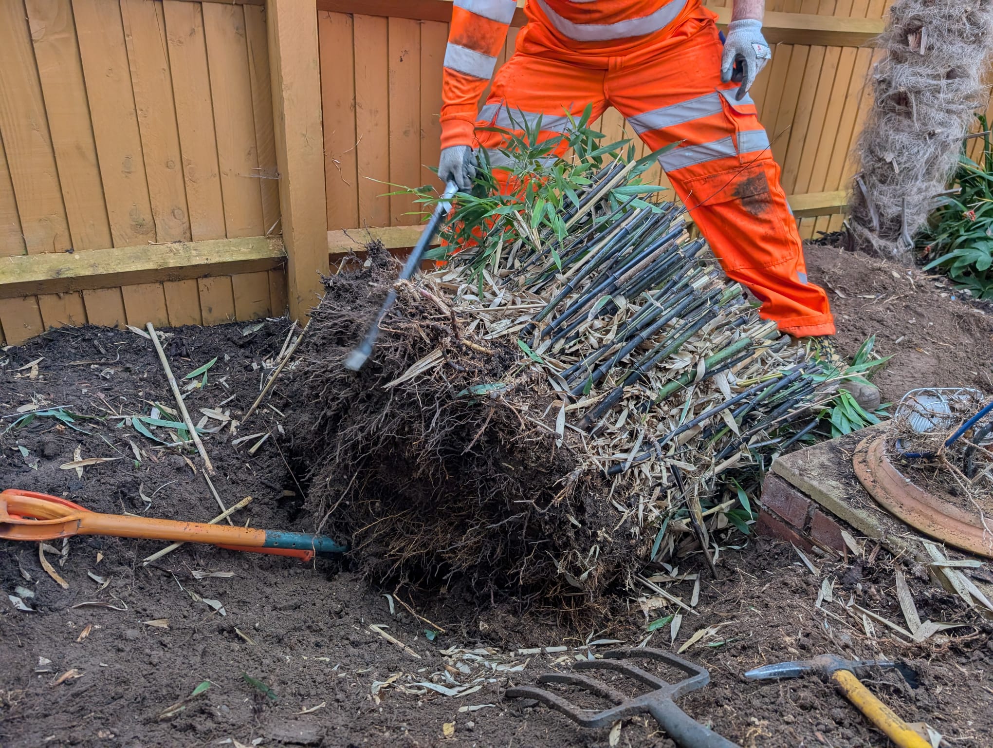 We carefully removed the stalks and the underlying rhizomes to ensure the homeowner now has a clear space ready for fresh landscaping.