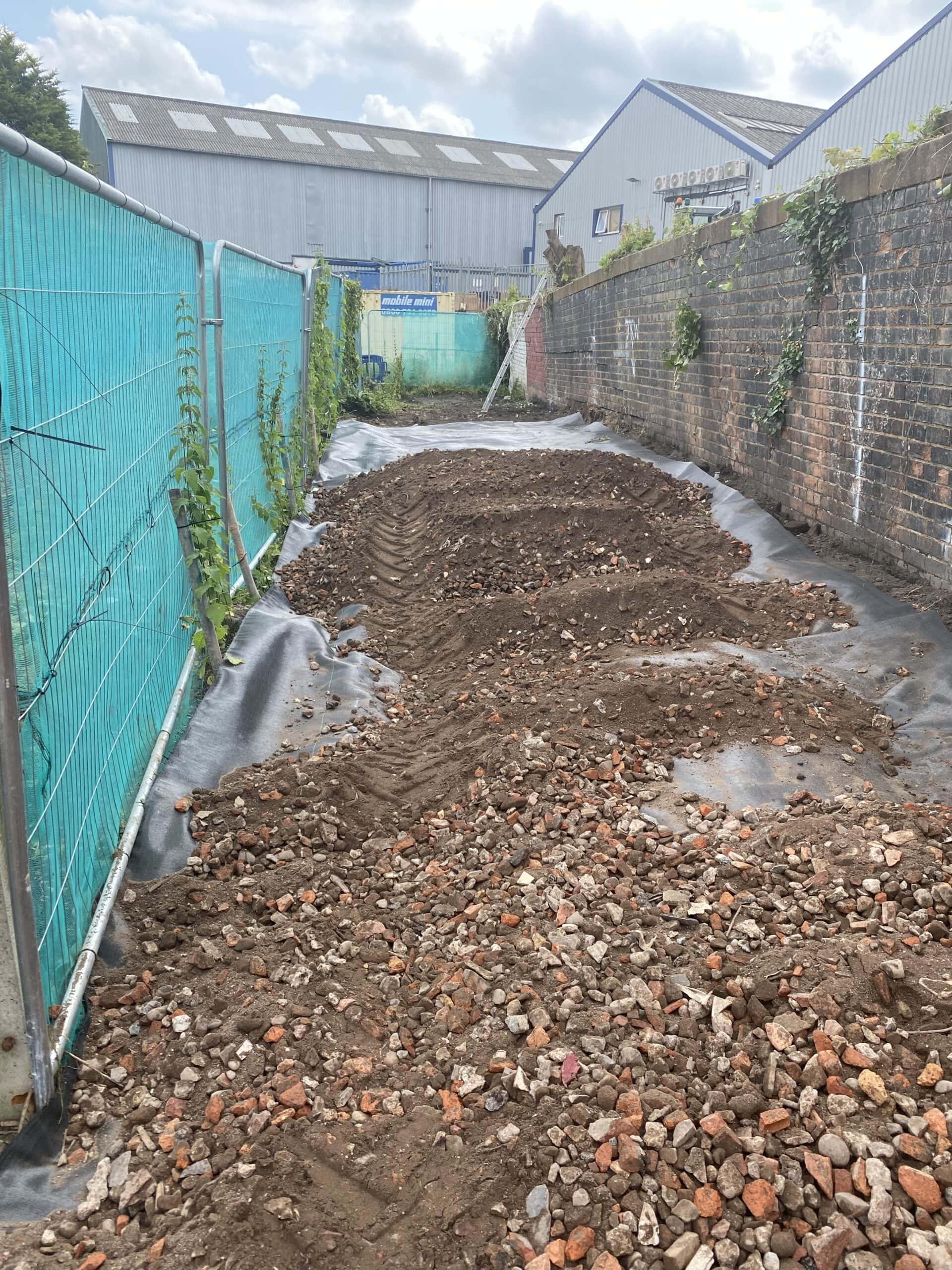 • A temporary geotextile barrier will be placed on the ground between the wall and the Heres fencing and then the client will provide plywood sheets over the barrier with a further amount of recycled stone to allow a 13T excavator to work within the site, away from the knotweed to prevent any cross contamination.