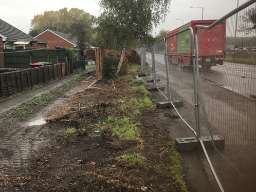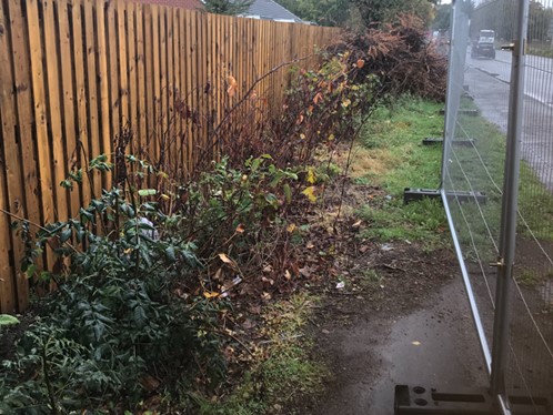 I informed our client at time of survey that to enable works, Highways would need to be notified due to close proximity of public footpath and barrier fencing would need to be installed to create a footpath on the road for members of the public. A tree that was approximately 10 metres tall would need to be cut down, which again, permission would need to be sought to cut down prior to our arrival. All fence panels and the line of bricks (wall) would also have to be taken away prior or during the excavation. Due to a public footpath running along both sides of the infestation, permission would have to be sought to dig into the areas which hopefully (I informed) would not cause any issues. Due to the area being next to a main road, the hole once we excavated would need to be back filled due to Health and Safety.