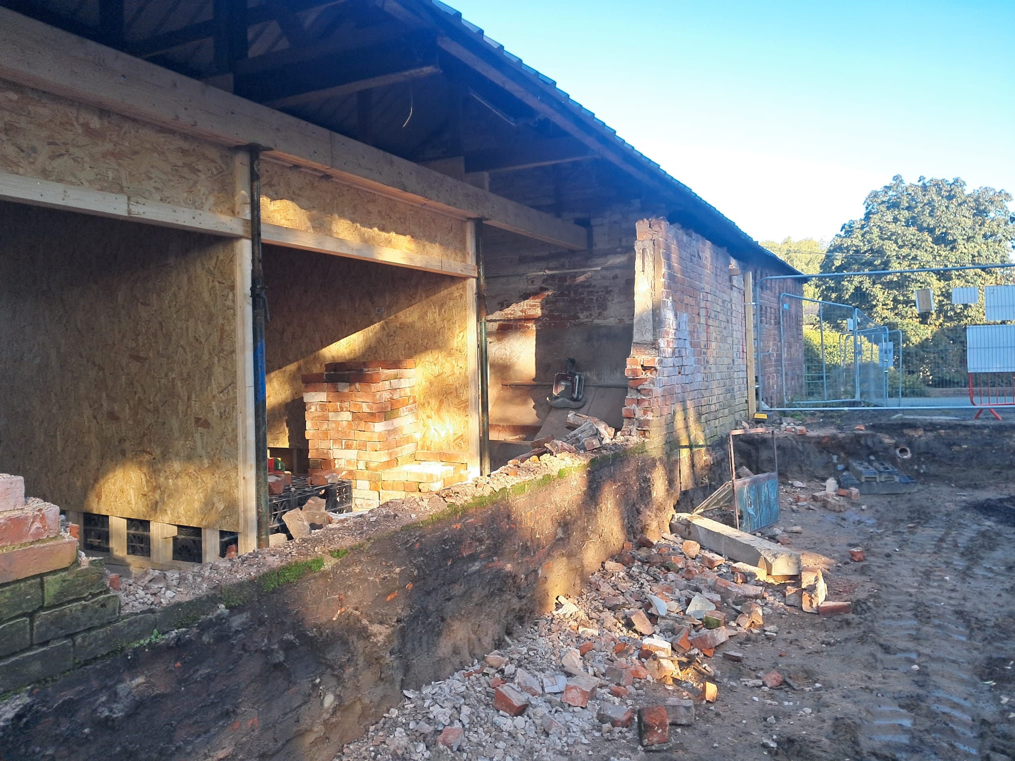 To begin the works, the frontage of the barn was carefully removed ensuring no damage to its façade and cleaning the removed bricks for the reinstatement at a later date. At the same time, an internal subframe was constructed and installed to stabilise the building and support the roof beams during the removal process.