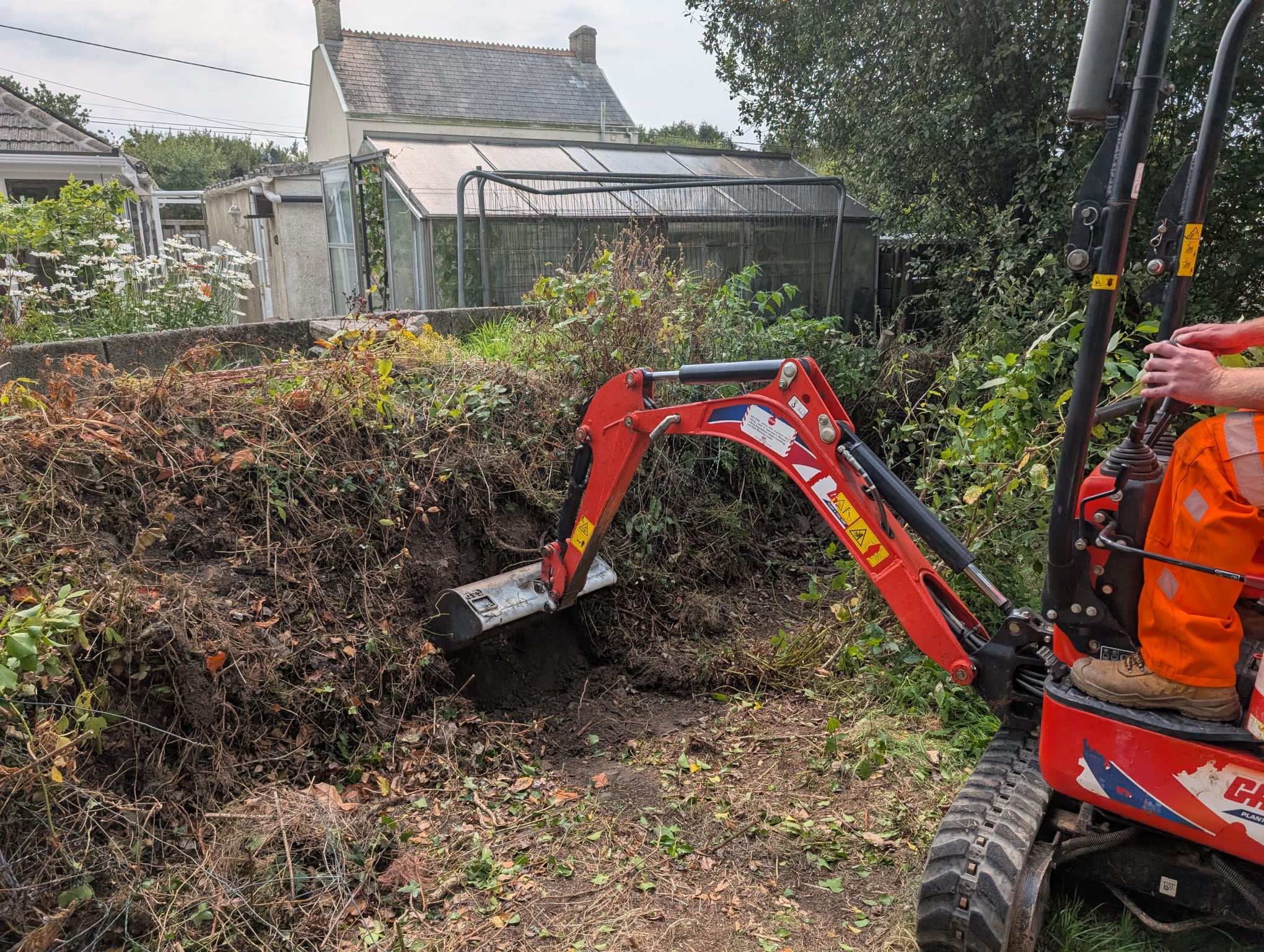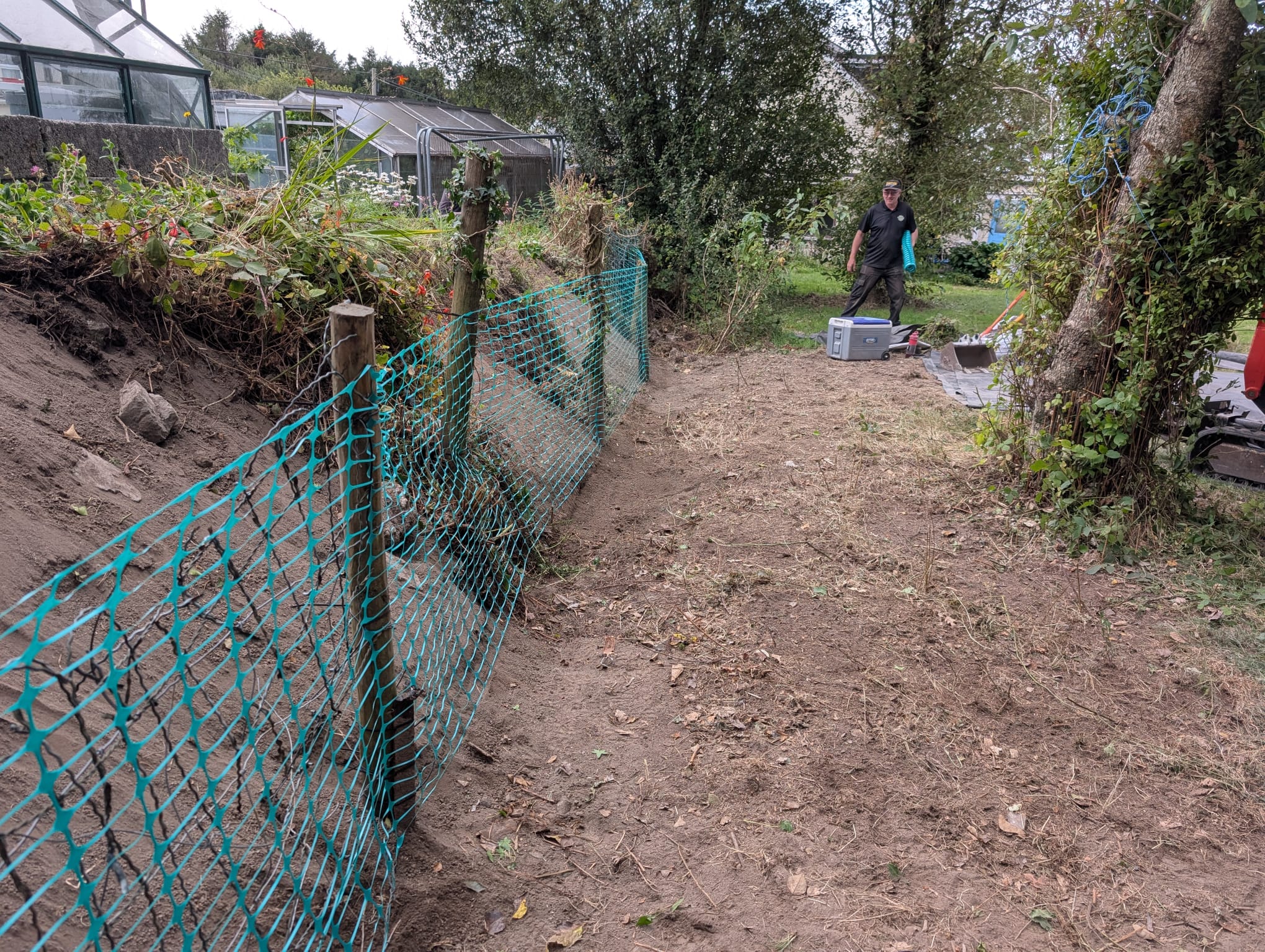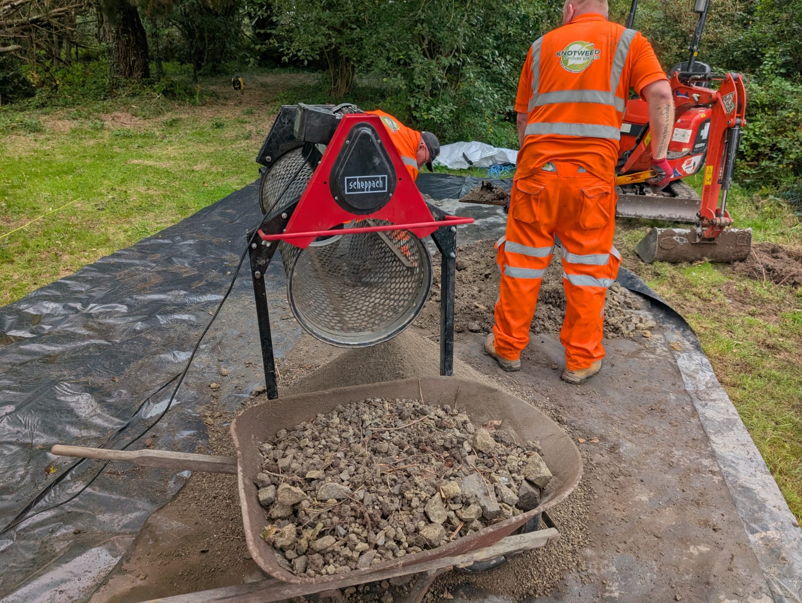 We used a mini digger to excavate the infestation and manually screened the soil using a small electric-powered trommel screener to remove all traces of knotweed rhizomes and material. The rhizomes and material were then placed in secure dumpy bags for onward transportation to a licensed landfill transfer station under EPA 1990 Duty of Care Guidelines. The cleaned soils were then backfilled into the excavated area.